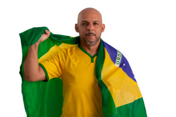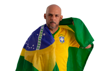 male fan wearing a yellow Brazilian football shirt and the Brazilian flag