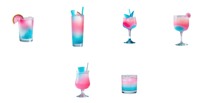 Variety of Miami Vice cocktails arranged on a transparent background featuring colorful layered drinks in different glassware styles with garnishes.