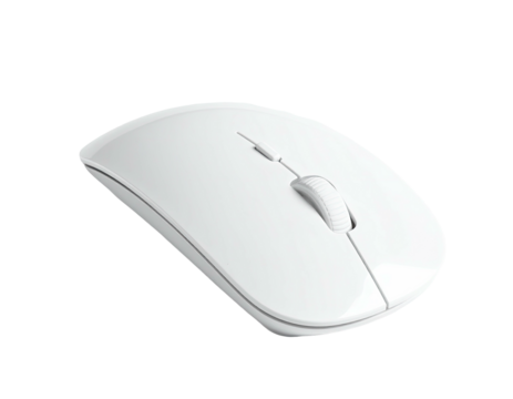 A sleek, white computer mouse, angled slightly, set against a stark black background