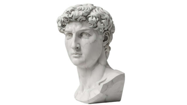 David bust isolated PNG on transparent background, Renaissance sculpture of a male head with curly hair, classical art for design and educational use