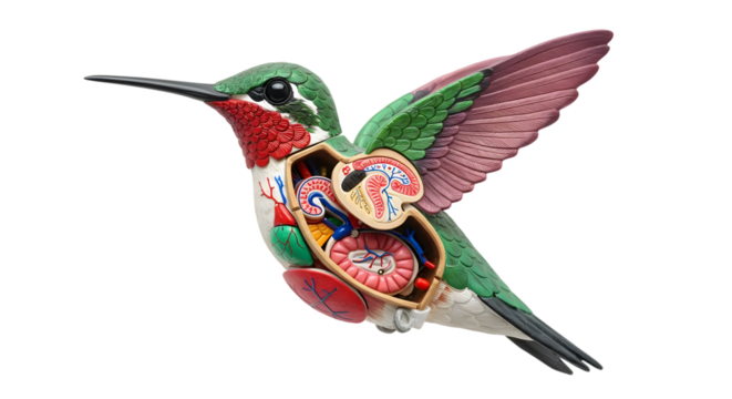Colorful Hummingbird with Exposed Anatomy, Showcasing Internal Organs, Vibrant Feathers and Unique Features in Artistic Representation of Nature