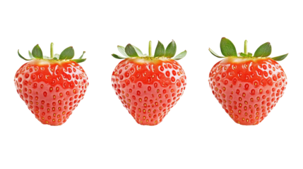 Three Fresh Ripe Strawberries Arranged in a Row on a Transparent Background