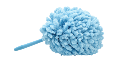 Bright blue feather duster with green handle isolated on transparent background