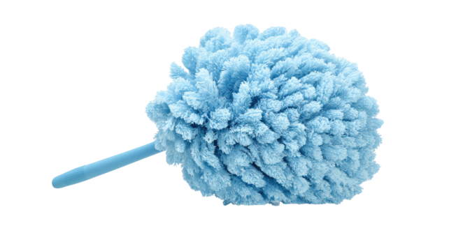 A fluffy blue microfiber duster with a green handle, isolated on a transparent background for cleaning tasks