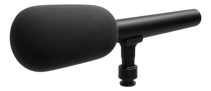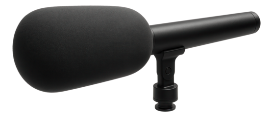 Professional black microphone with a large foam cover and a sleek design on transparent background.