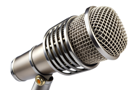 Vintage microphone on a stand, broadcasting sound and music, representing retro radio shows and performance audio on transparent background