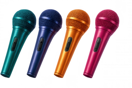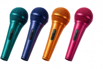 Four colorful microphones lying on a transparent background, ready for a karaoke night or a music performance
