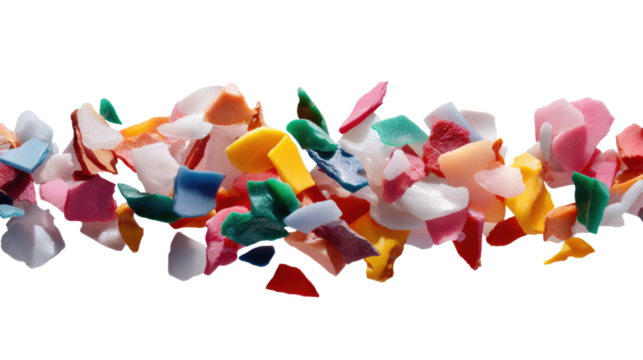 Rainbow of Plastic Fragments: A captivating image showcases a vibrant spectrum of colorful plastic fragments scattered mid-air, highlighting the environmental impact of plastic waste.