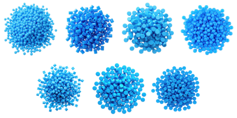 Various Blue Plastic Pellets of Different Shapes and Sizes Piled on a transparent Background Isolated for Material Design and Industrial Use
