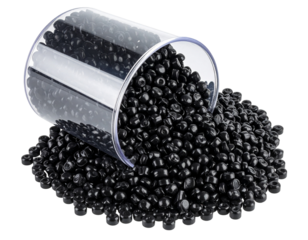 Black Plastic Pellets Spilling from Clear Jar – Industrial Minimal PNG