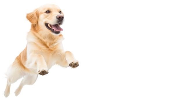 Fluffy Labrador puppy leaping happily. Puppy jumps in mid air.