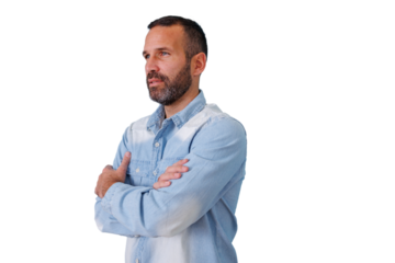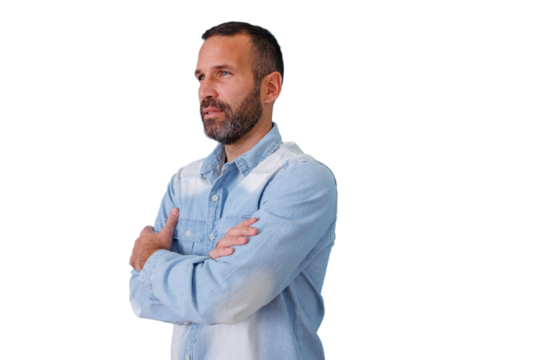 Smiling professional man holding a modern tablet, planning digital strategy, standing confidently. Transparent background