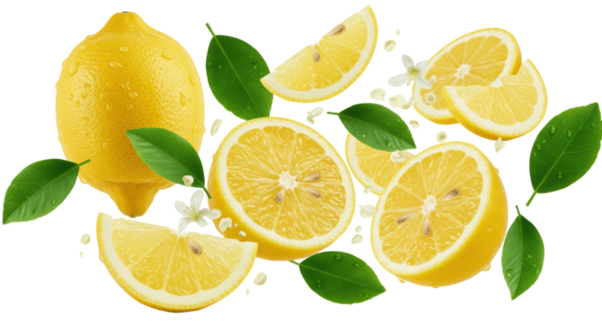 Vibrant whole lemons, halves, slices, and fresh green leaves suspended dynamically in mid-air against a transparent studio background, captured with macro detail. Concept of natural purity and zest