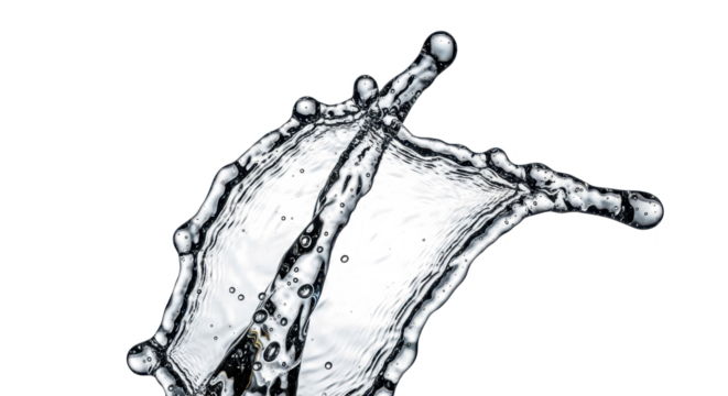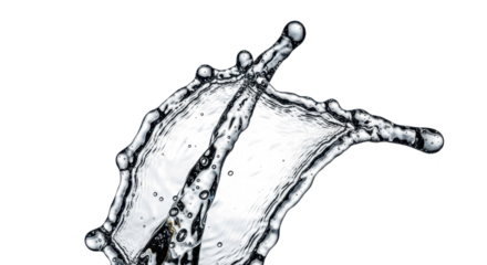 Liquid splashes powerfully in midair with dispersed droplets against a stark isolated background.