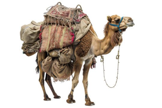 Camel carrying heavy load across desert terrain under the midday sun in a vibrant, arid landscape