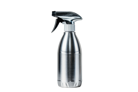 A sleek silver spray bottle releasing a fine mist in a bright and clean setting during midday light isolated on transparent background