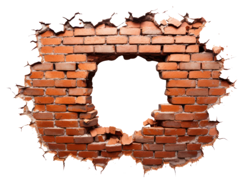Old brick wall with a large hole in the middle. Abstract background in red and gray and with copy space.