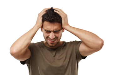 Headache, frustrated and man with stress pressure due to burnout isolated in a transparent or png background. Pain, inflammation and male person with migraine discomfort, fatigue and overworked