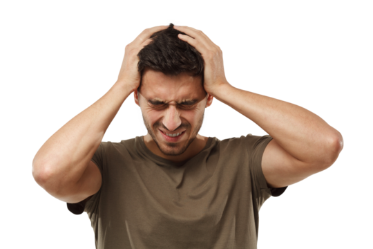 Isolated young man, headache and portrait with pain, stress and worry by transparent png background. Guy, tired or fatigue with burnout, hurt and migraine with health problem, risk and exhausted