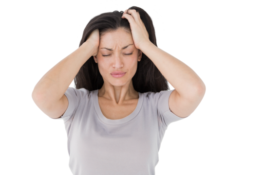 Woman experiencing intense headache and migraine pain holding temples with closed eyes transparent background