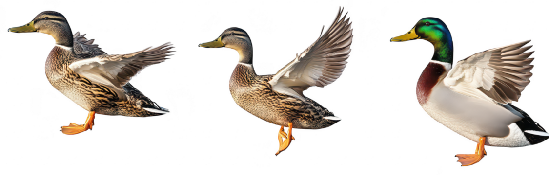Three mallard ducks in mid-flight their plumage and dynamic wing positions against a clean white background. ideal for nature-themed projects or educational materials
