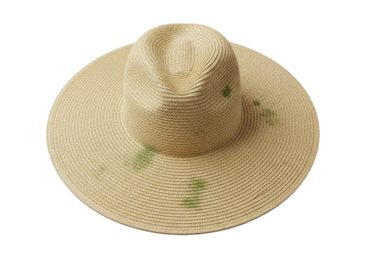 Wide-brimmed straw hat with delicate texture and green mildew spots, on a seamless transparent background with professional studio lighting, no shadows, commercial product photography concept