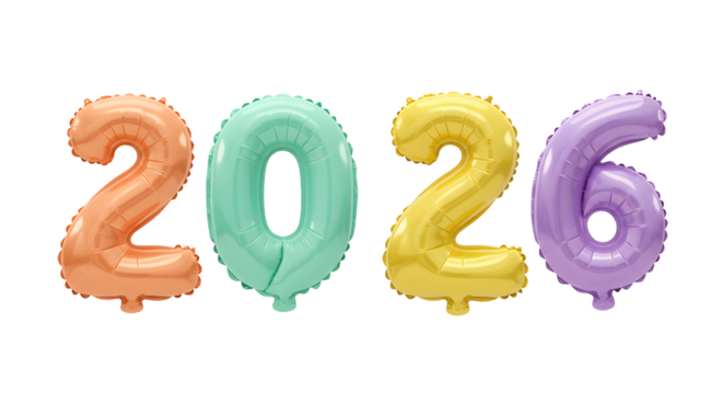 Colorful metallic foil balloons shaped as the numbers 2026, perfect for New Year celebrations or milestone events
