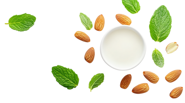 Glass of almond milk with almonds isolated on transparent background, healthy drink
