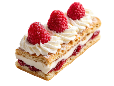 Raspberry mille-feuille delight: A mouthwatering shot of mille-feuille pastry, layered with smooth, creamy filling and topped with plump, fresh raspberries. An irresistible treat for dessert lovers!