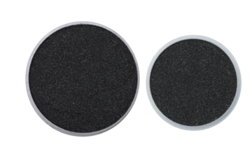 Specimens of milled Ilmenite mineral sand on small trays on isolated white background