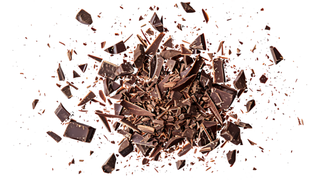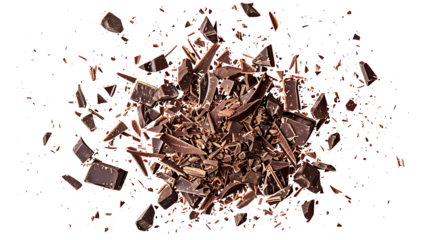 Pile chopped, milled dark chocolate isolated on white, top view