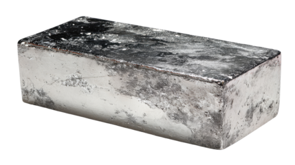 Rectangular, heavy, metallic ingot.  Rough, mottled gray surface