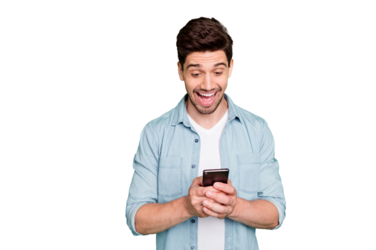 Photo of amazing guy holding telephone read new cool instagram post comments overjoyed positive reviews wear denim shirt isolated green color background