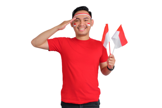 Happy young Asian men salute gesture while holding Indonesia flag isolated on transparent background. Indonesian independence day concept