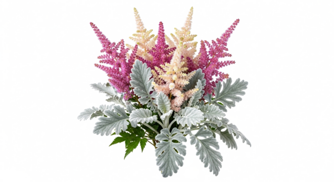 Elegant Pink and Cream Astilbe and Dusty Miller Floral Arrangement Isolated on White