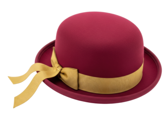 Elegant burgundy bowler hat with gold ribbon isolated PNG, vintage style headwear for fashion design and millinery projects