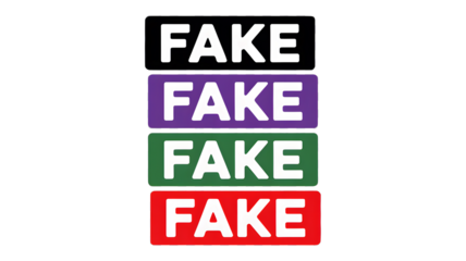 A stack of four rectangular signs displaying the word fake in different colors on a black background
