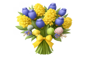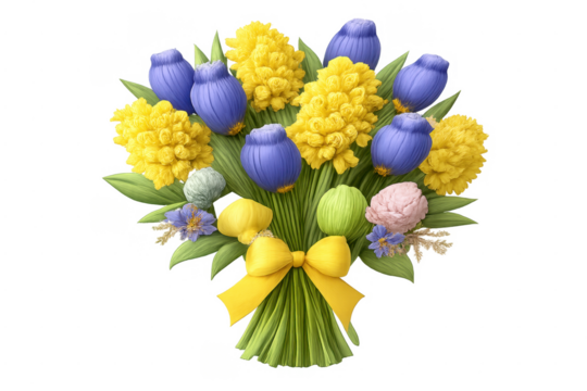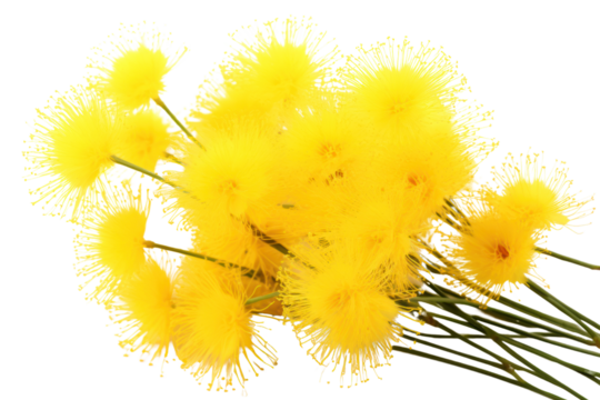 Bouquet of fresh spring yellow flower mimosa isolated on white background, as a gift for Mom's day or Valentine's day. Floral symbol of spring, heat and sun, png, DOF. Shallow depth of field