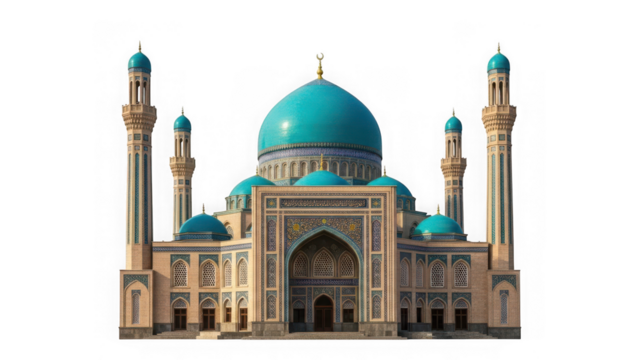 Beautiful mosque with blue domes and minarets isolated on transparent background