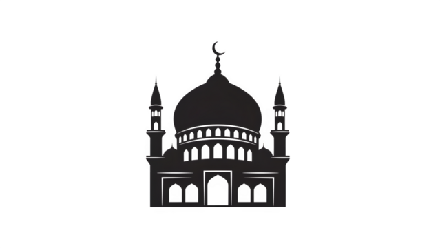 Islamic mosque silhouette with towers and arches on transparent background