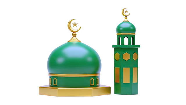 Cartoon mosque with green dome and minaret on a white background.
