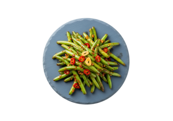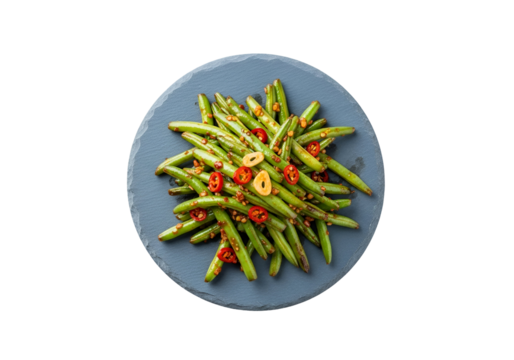 A high-angle, close-up view of a plate of savory stir-fried green beans, garnished with red chili peppers and minced garlic.