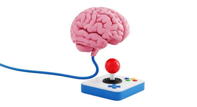 3d quiet mind app icons brain connected to a video game controller isolated on transparent background