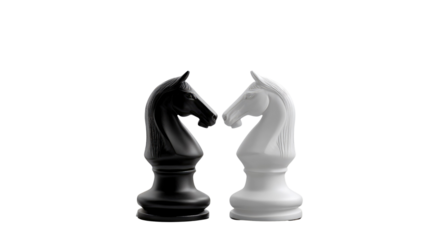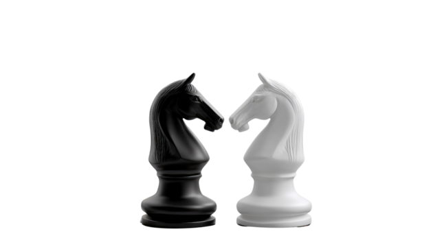 Chess Knights: A close-up perspective of two opposing chess knights, one in bold black and the other in pristine white, positioned to symbolize strategic thinking.