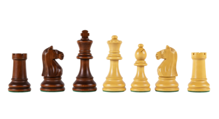 Full set of dark and light wooden chess pieces, isolated on transparent background, PNG