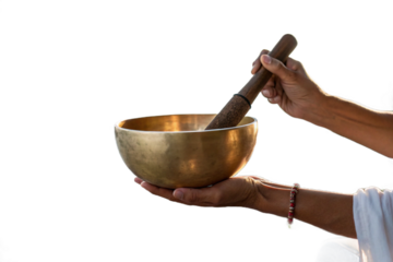 A solitary, gleaming brass singing bowl rests in isolation against a stark white backdrop, evoking a sense of tranquility and mindfulness