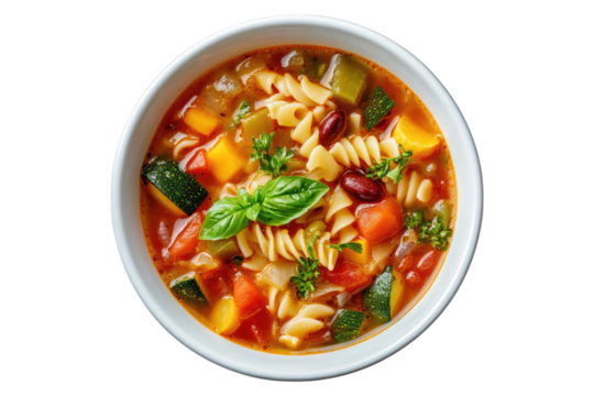 Bowl of minestrone soup with pasta and vegetables isolated on transparent background