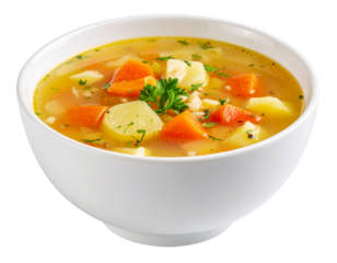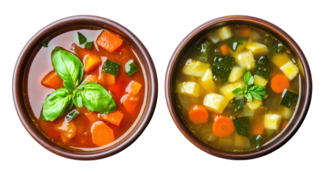 Bowl of vegetable soup isolated on transparent background, PNG format, cut out