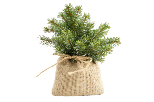 Mini Christmas tree in a burlap sack with sparse decoration isolated on a transparent background