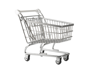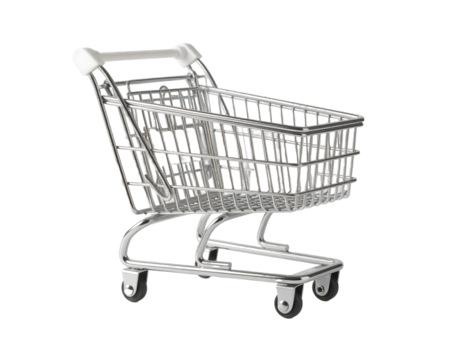 Isolated miniature shopping cart, a small metal supermarket trolley with colorful accents